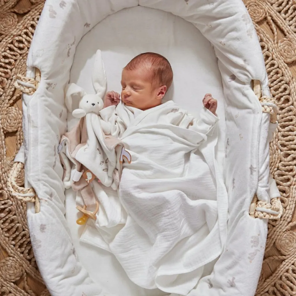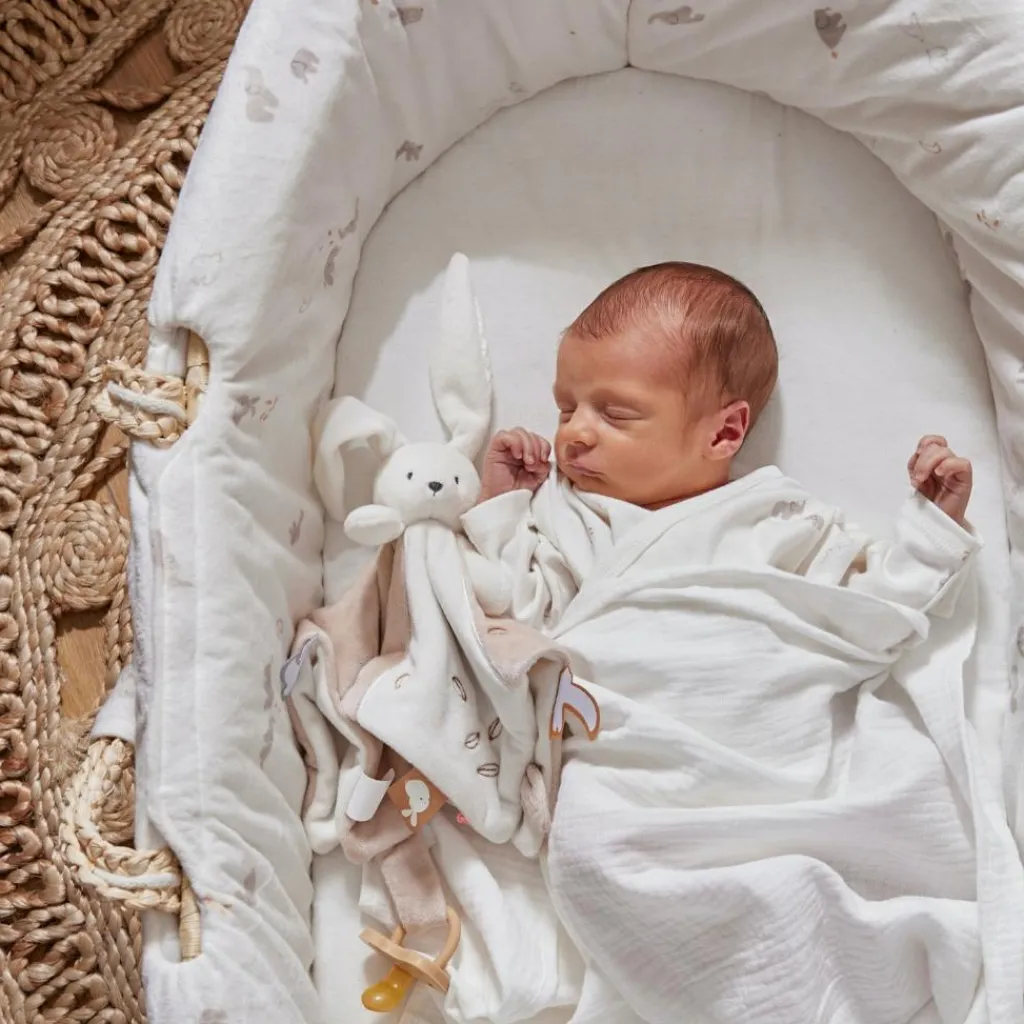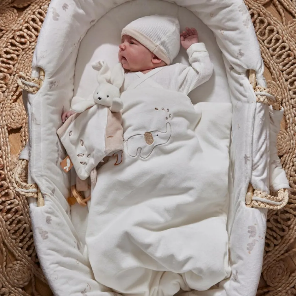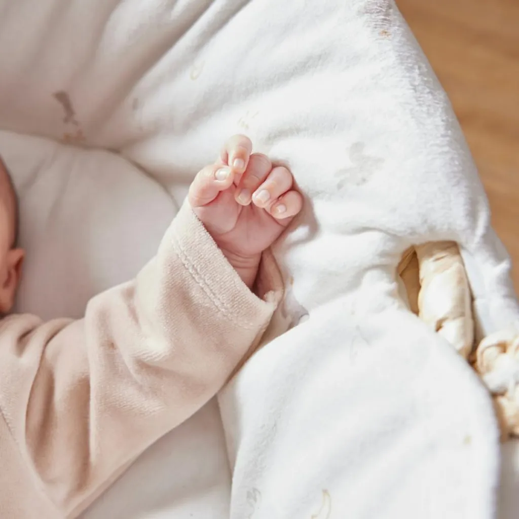 – Le couffin Noukie’s, avec son imprimé douxen Veloudouxécru de Bali et Moka, offre un environnement sécurisé et confortable pour le sommeil de bébé.