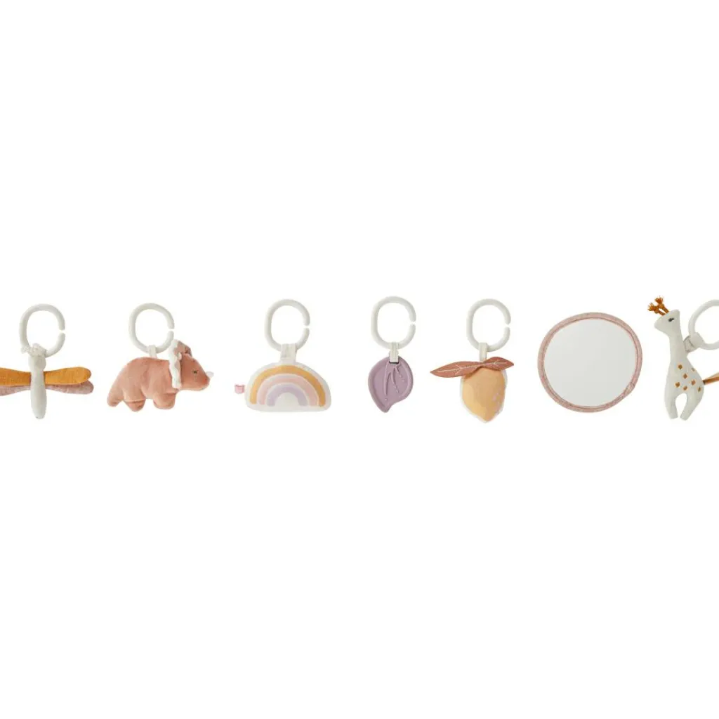 – Différentes matières, sons et activités : miroir, pouët, papier froissé, grelot, hochet, jouet de dentition.