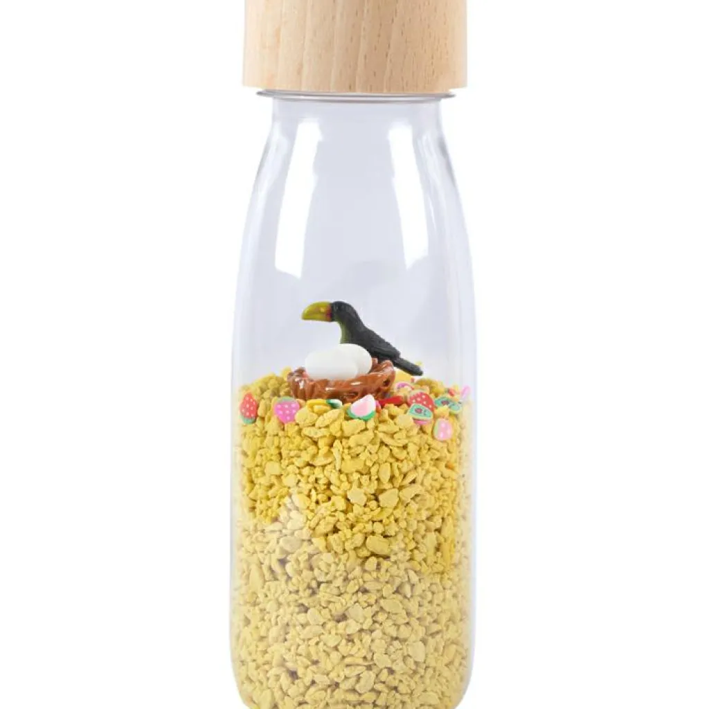– Peut être utilisée de multiples manières : observer les éléments, faire rouler la bouteille, la secouer, empiler plusieurs bouteilles…