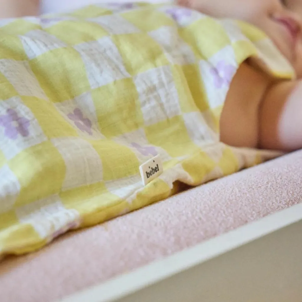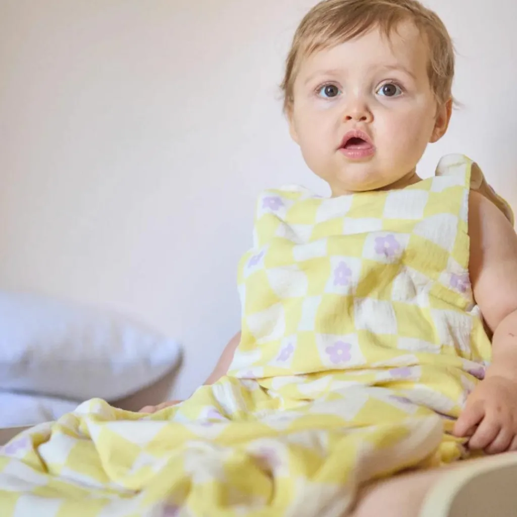 Avec son adorable motif damier fleuri exclusif et ses coloris lumineux (bleu ou jaune), cette turbulette légère devient un indispensable des nuits d’été. Imaginée pour combiner style et praticité, elle est confectionnée en double gaze de coton , une matière douce, respirante et respectueuse de la peau sensible des tout-petits.