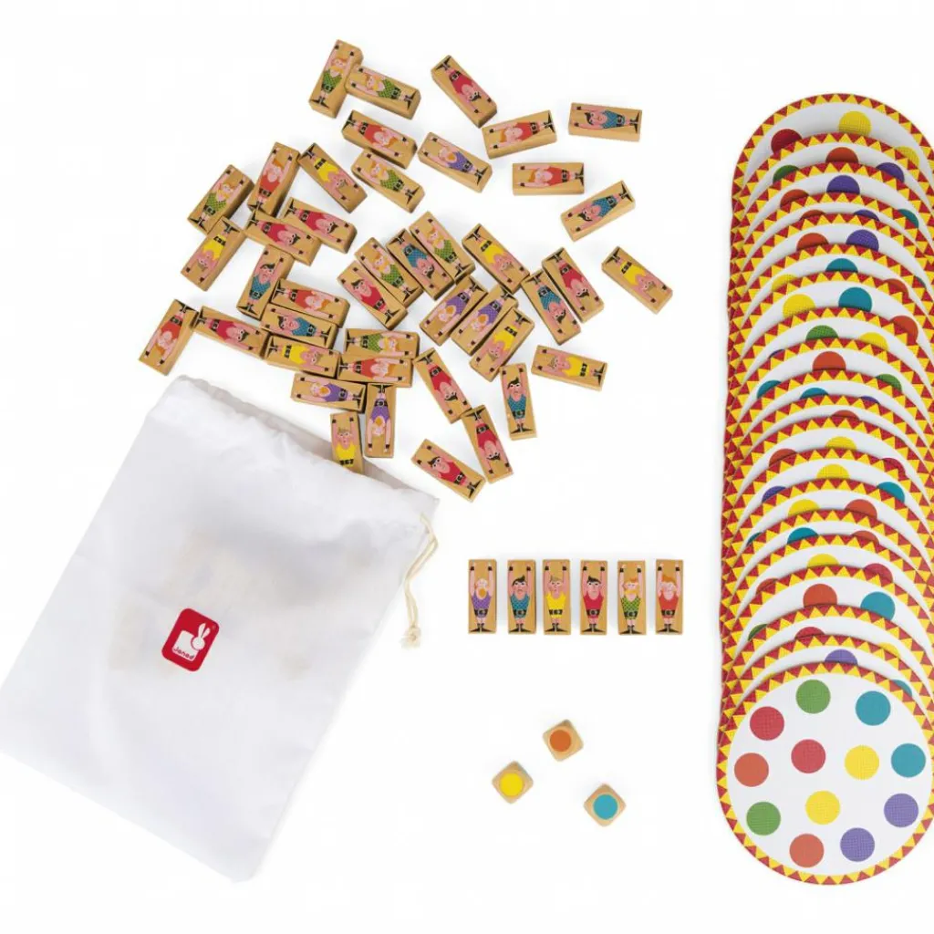 Lancez les dés puis placez vos acrobates de façon stratégique pour créer la tour la plus haute possible. Le premier à la faire tomber a perdu !