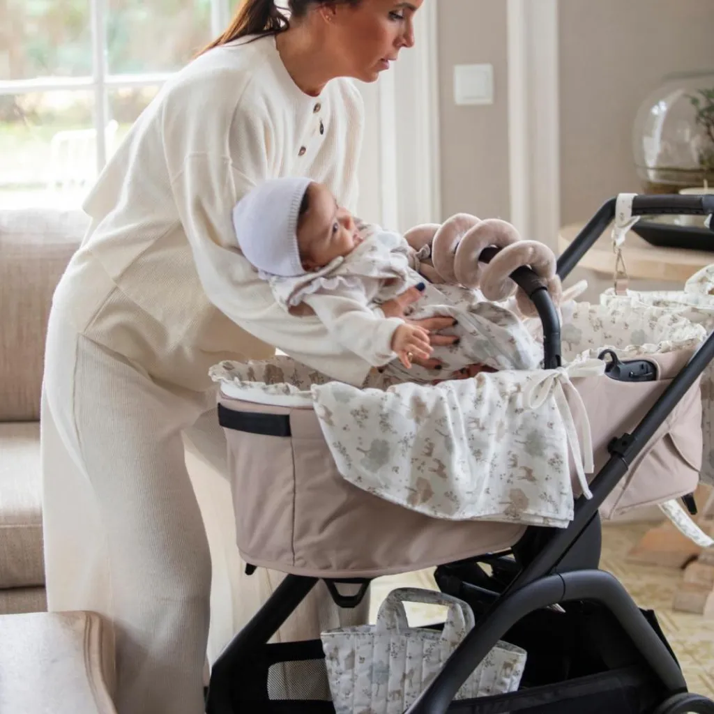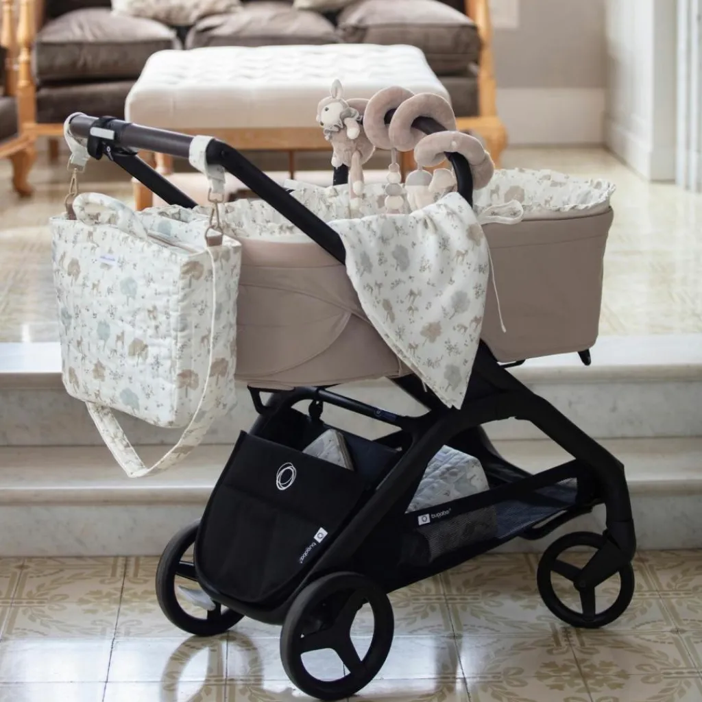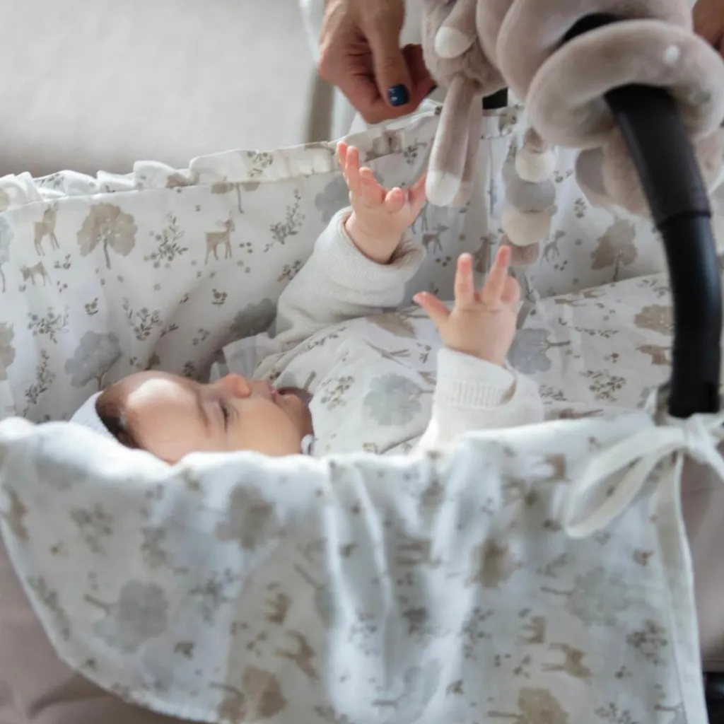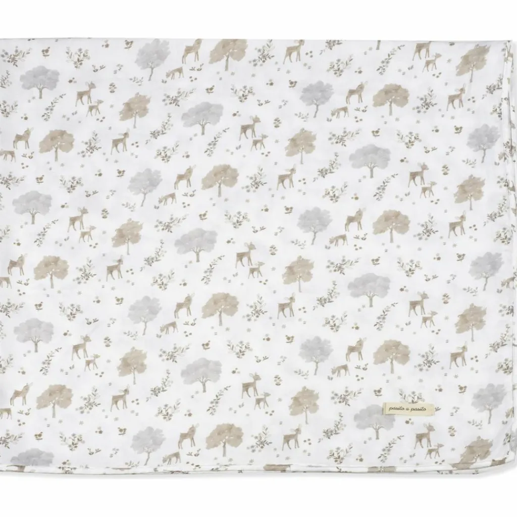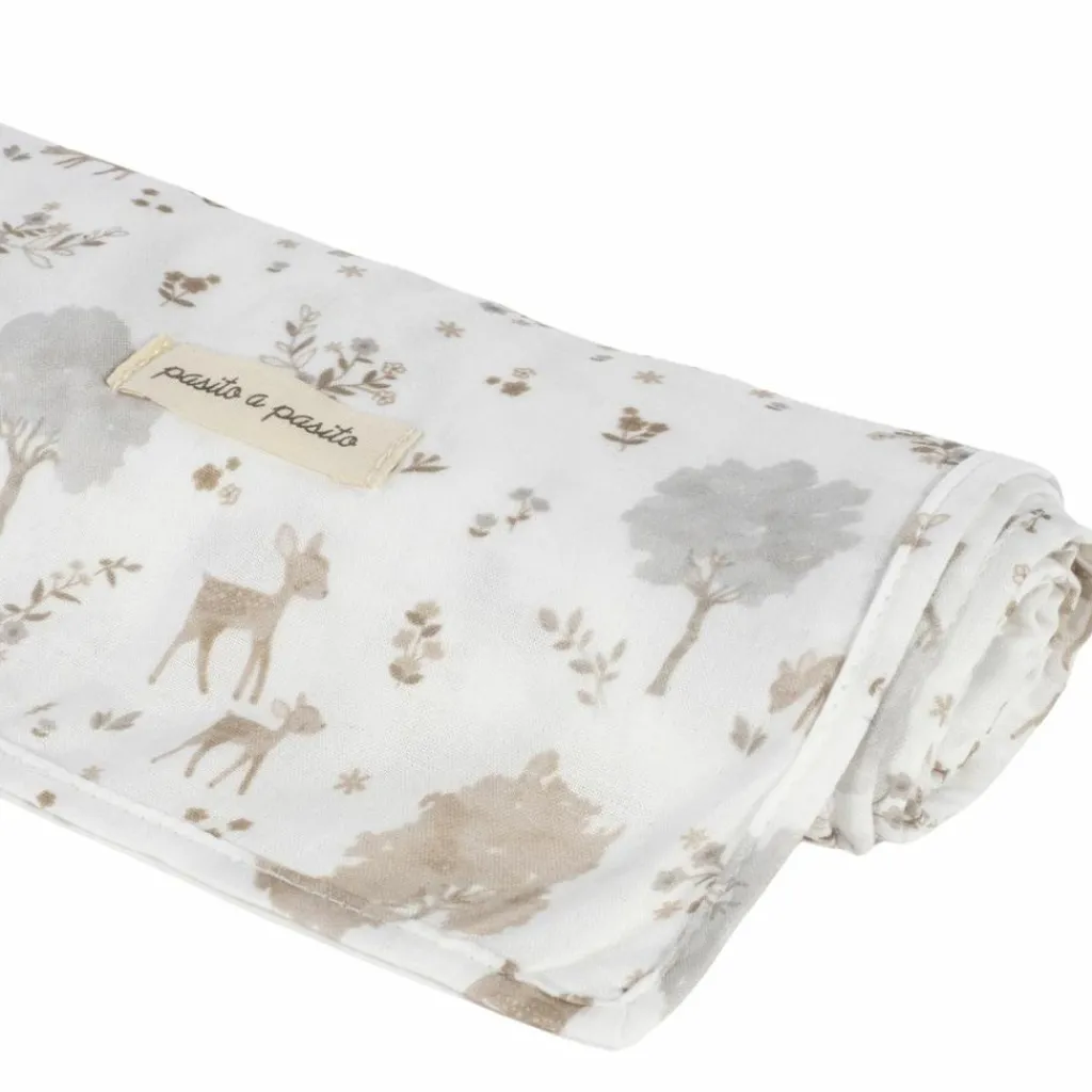 – Le lange Nara imprimé de cerfs et d’arbres dans des tons neutres par Pasito a Pasito est l’accessoire essentiel pour prendre soin de bébé.