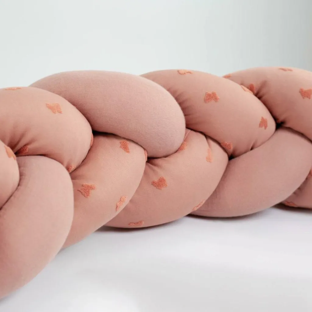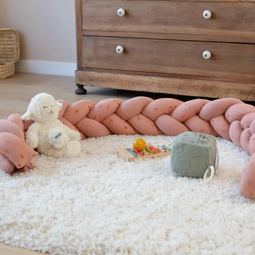 Avec sa belle teinte vieux rose délicatement ornée de petits motifs, cette tresse décorative crée une ambiance chaleureuse et élégante dans la chambre de bébé. Douce et généreusement rembourrée, elle invite à la détente et à la sérénité. Polyvalente, elle s’utilise aussi bien comme élément décoratif que pour délimiter un espace de jeu confortable et sécurisé.