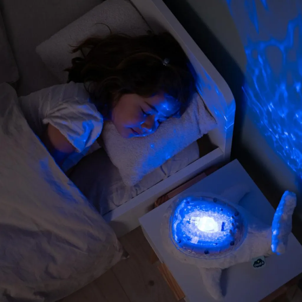 La Tranquil Whale diffuse une douce lumière et projette sur le plafond de la chambre les vagues de l’océan en mouvement grâce à un mécanisme unique et breveté. Une mélodie marine et le son des vagues (bruit blanc) apaiseront les tout-petits pour les emmener sur le chemin du sommeil.