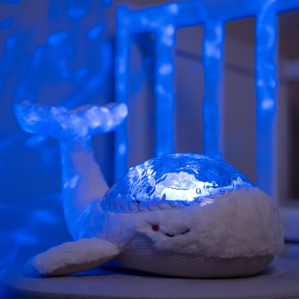 – Tranquil Whale (rechargeable), jolie baleine musicale fabriquée en fibres 100% recyclées, issues de bouteilles en plastique qui diffuse une douce lumière et projette sur le plafond de la chambre les vagues de l’océan en mouvement grâce à un mécanisme unique et breveté.