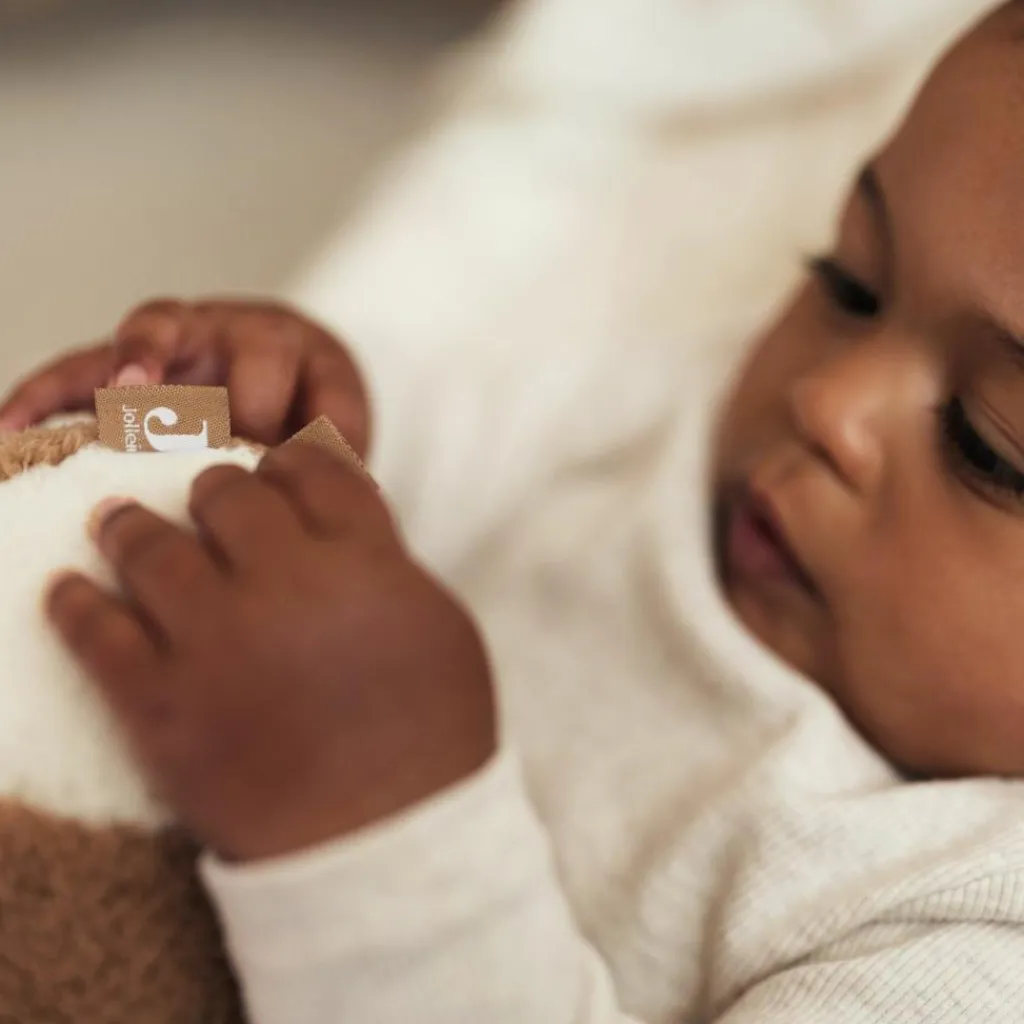 Éveillez les sens de votre bébé avec la Balle d’éveil Ivory-Biscuit de Jollein, un jouet doux et sensoriel parfait dès les premiers mois.