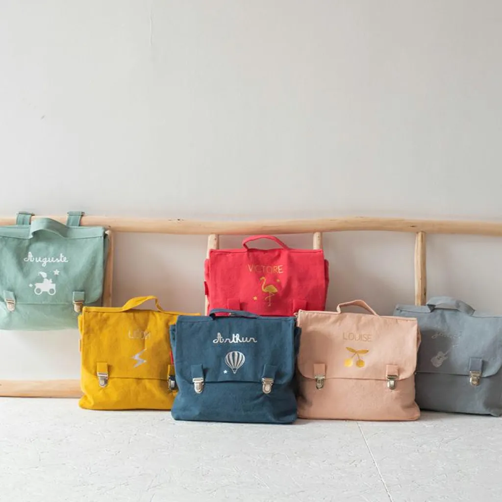 Créé et fabriqué en France, ce cartable en toile de coton épaisse et résistante (400 g/m²) allie qualité et style. Grâce à la personnalisation, vous pouvez ajouter le prénom, un surnom ou même un joli motif pour en faire un modèle unique qui accompagnera fièrement votre enfant à l’école.