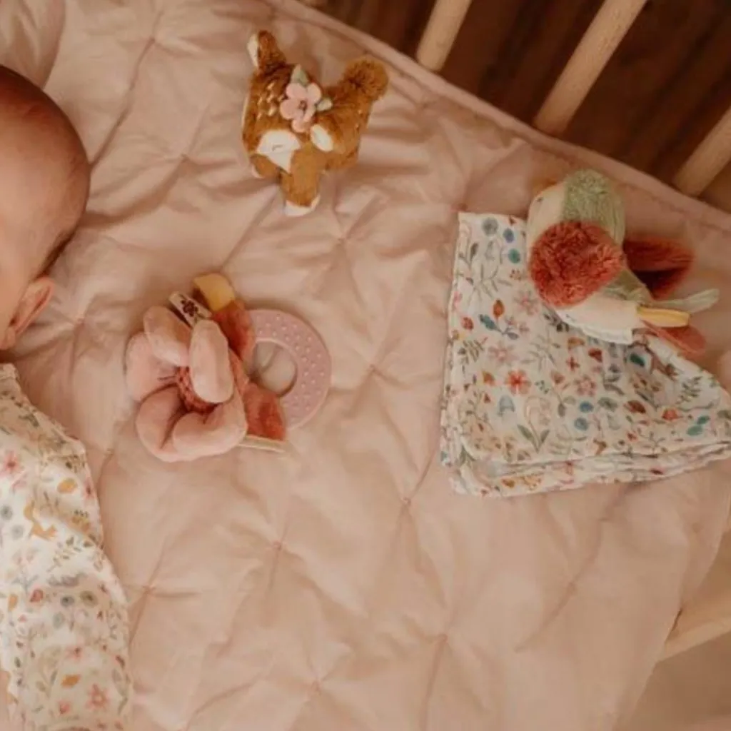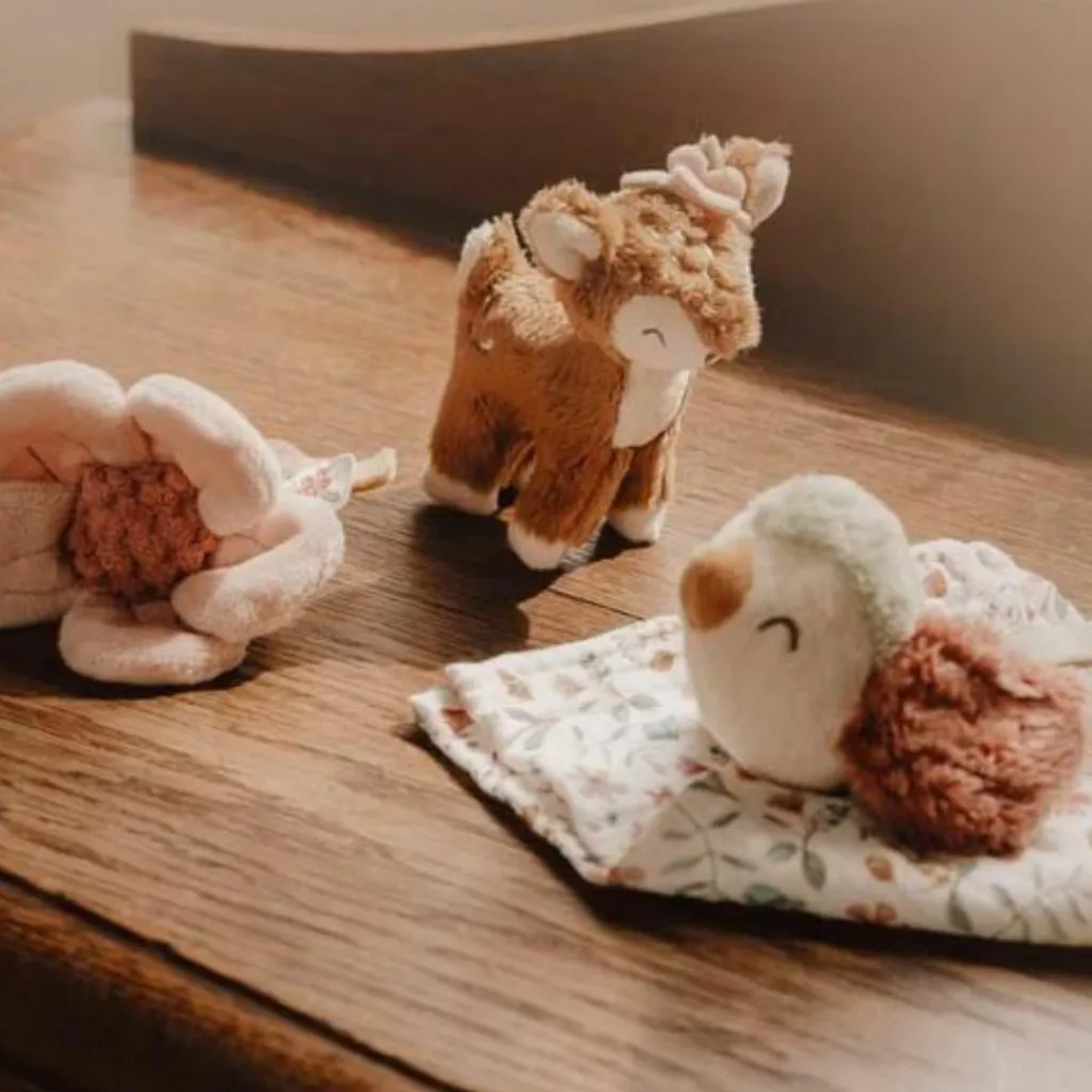 – Le coffret cadeau – Fairy Garden réunit trois compagnons tout doux pour réconforter et éveiller bébé: un adorable doudou oiseau, un faon âlin et un anneau de dentition fleur.