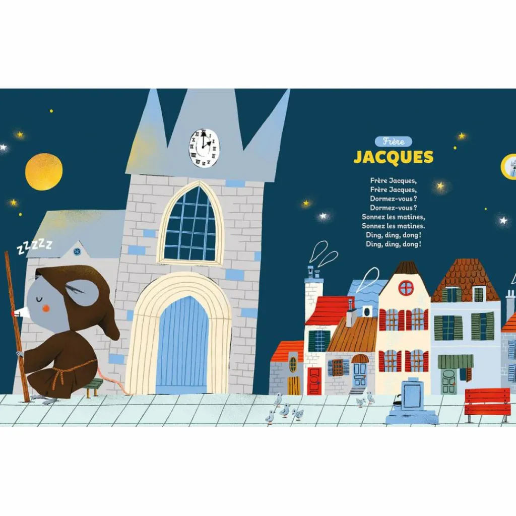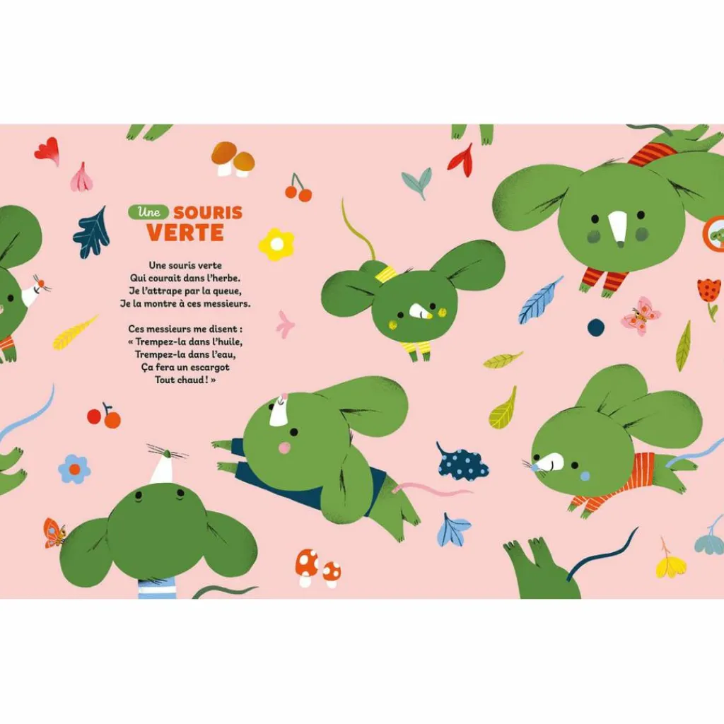 – 1 livre tout carton avec 20 comptines célèbres illustrées (avec les paroles pour chanter).