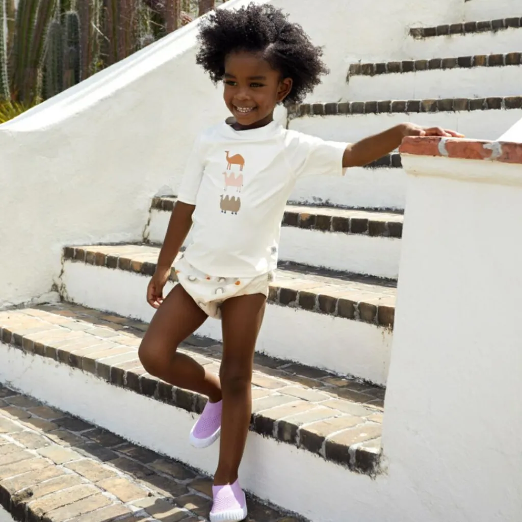 – Composé à 82% de polyester (recyclé) et de 18% d’élasthanne permet de profiter pleinement du plaisir de la baignade grâce à son indice de protection UV de 60 et de ses imprimés fantaisie.