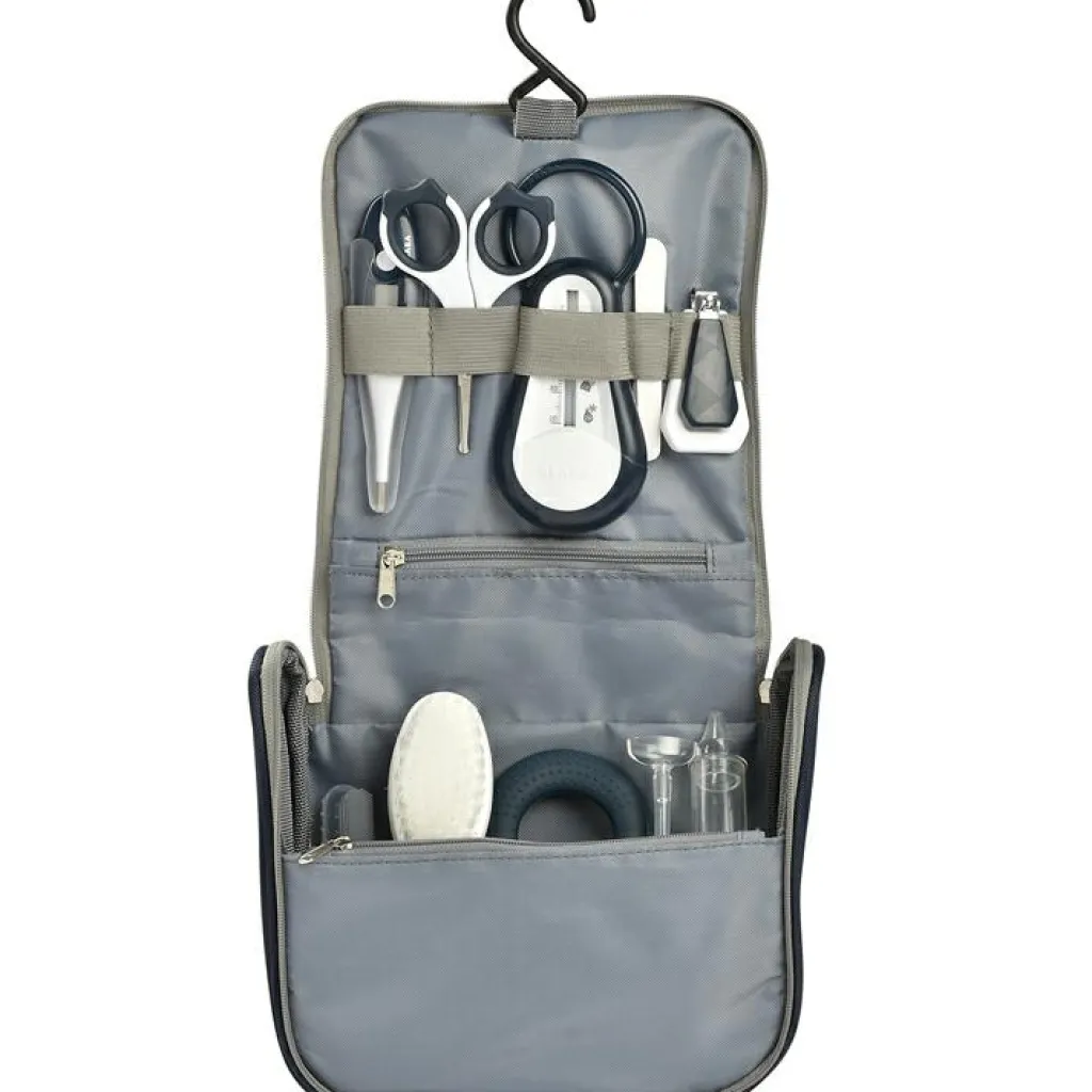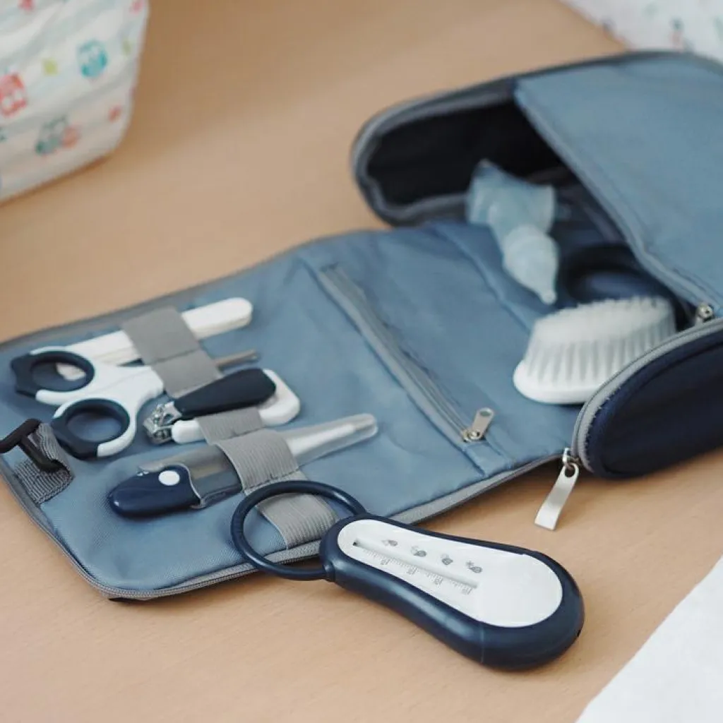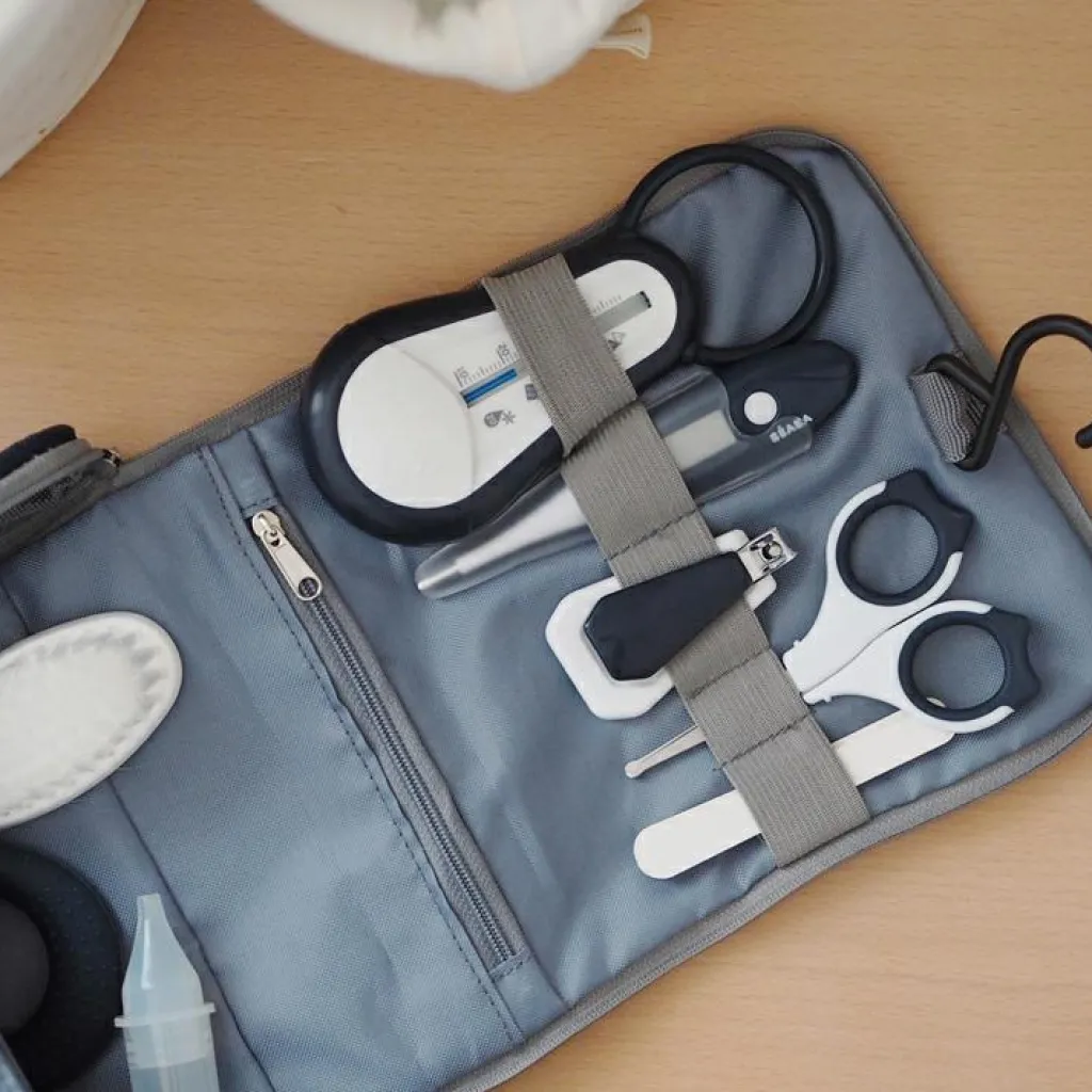 – 9 accessoires (1 thermomètre de bain, 1 thermomètre digital, 1 paire de ciseaux, 1 coupe-ongles, 1 brosse à cheveux, 1 anneau de dentition, 1 masseur de gencives, 1 mouche bébé manuel, 1 lime à ongles).