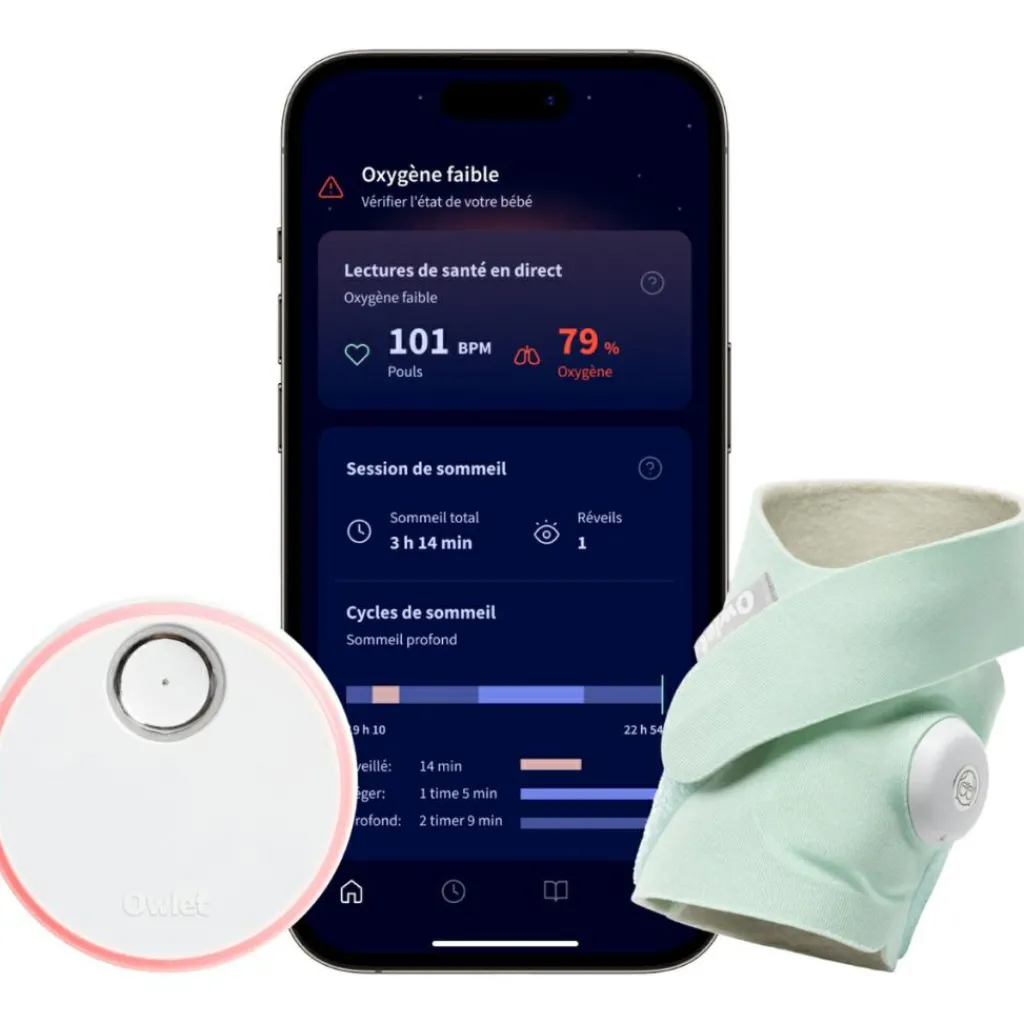 – Owlet Dream sock : système de surveillance intelligent pour bébé médicalement certifié avec notifications de fréquence cardiaque, d’oxygène et de santé en direct.