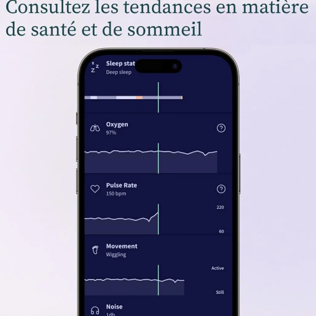 – Consultez les tendances en matière de santé et de sommeil : consultez l’historique du pouls et de l’oxygène de votre bébé dans l’application Owlet Dream pour obtenir des informations précieuses sur les tendances de santé de votre bébé au fil du temps.