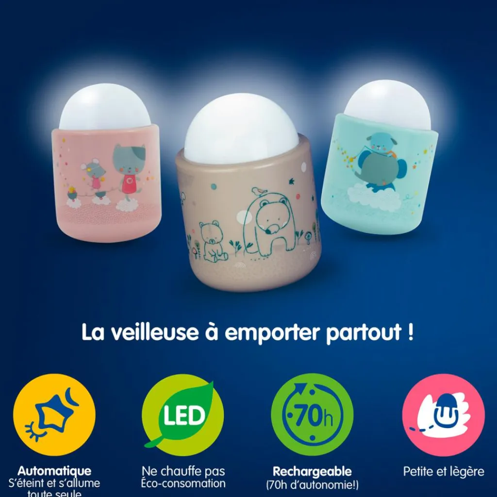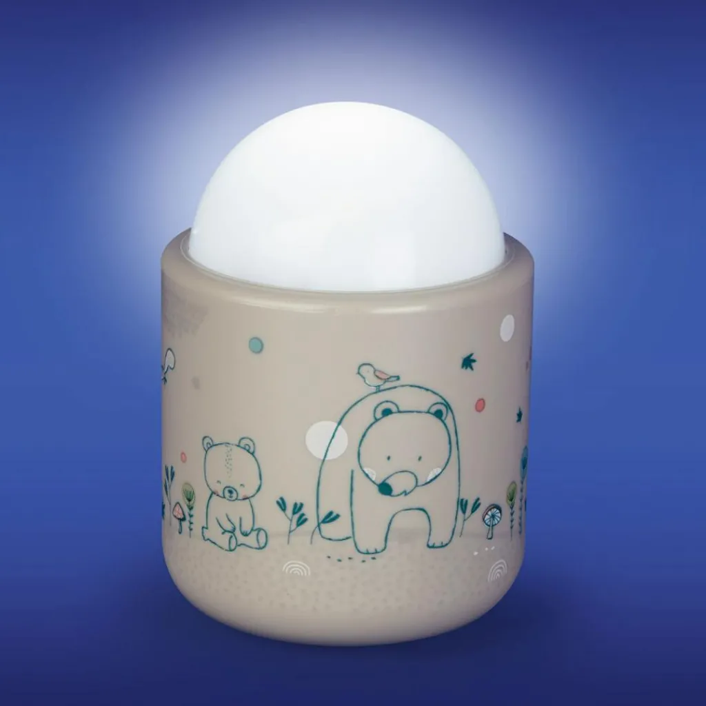 La veilleuse nomade beige Dans les bois par Pabobo s’emporte et se pose partout : table de chevet, à côté du lit, commode… Petite et légère, elle est adaptée aux mains des petits.