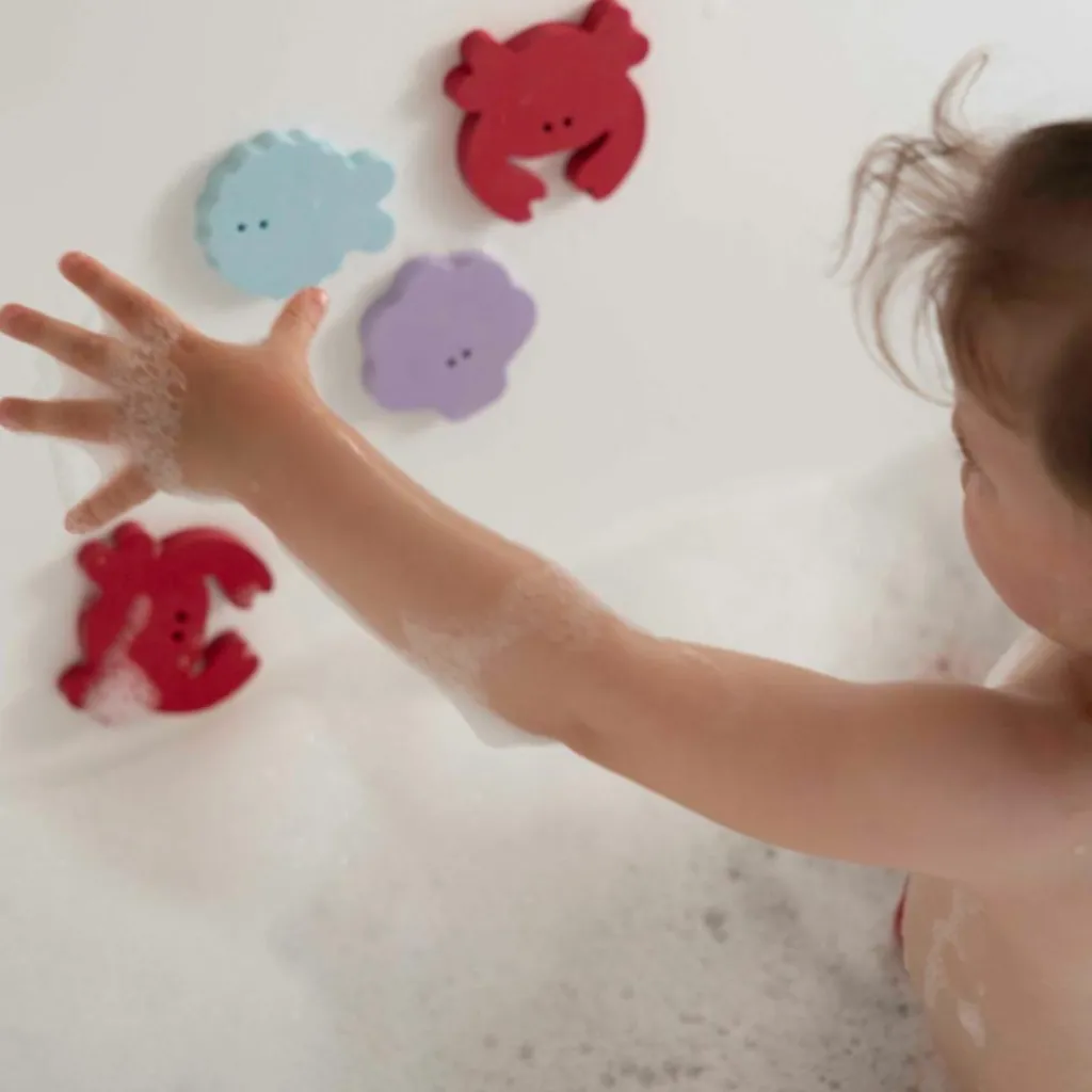 Dès 10 mois, bébé découvre les formes en mousse EVA douce, qui flottent et adhèrent facilement aux parois de la baignoire ou de la douche. Il s’amuse à les coller, les décoller et les manipuler, développant ainsi sa motricité fine et son imagination.