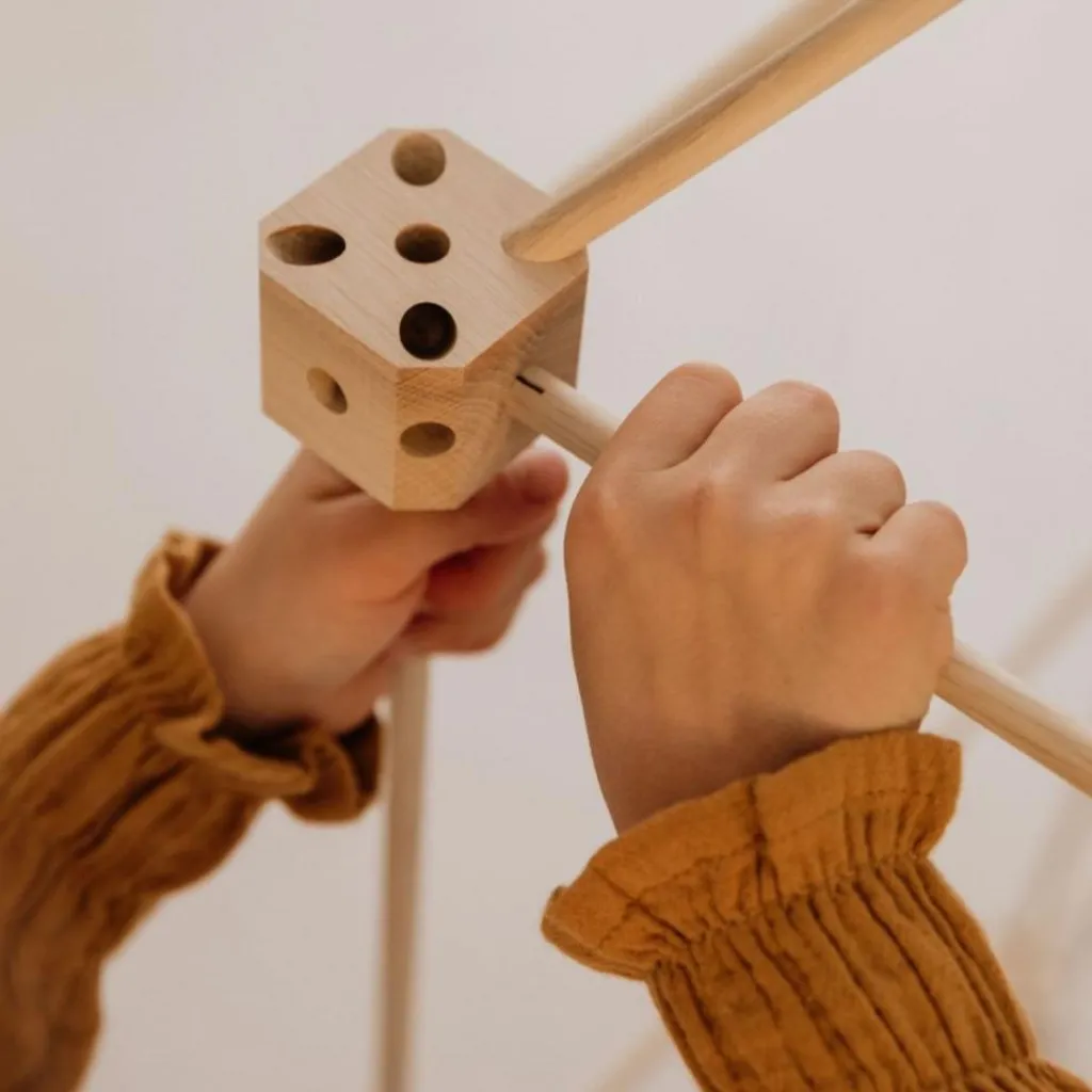 – Des pièces en bois brut – Comme tous les kits de construction 1001 Cabanes, ce Pack contient 2 modèles de pièce en bois : des tiges et des connecteurs en forme de pavé rectangulaire percés de 18 trous.