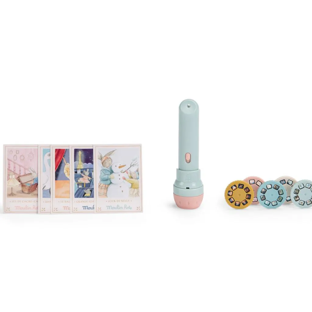 – Contient une lampe à histoires, 5 disques sur l’univers des contes et 5 cartons d’invitation.