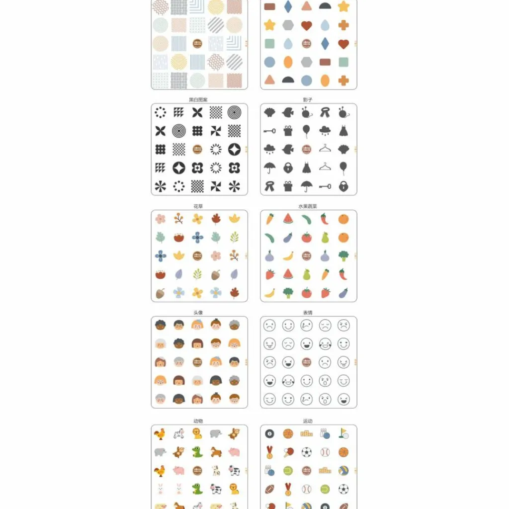 – 10 thèmes : traits, noir/blanc, formes géométriques colorées, ombres, visages, smileys, animaux, sport, fleurs, fruits/légumes.
