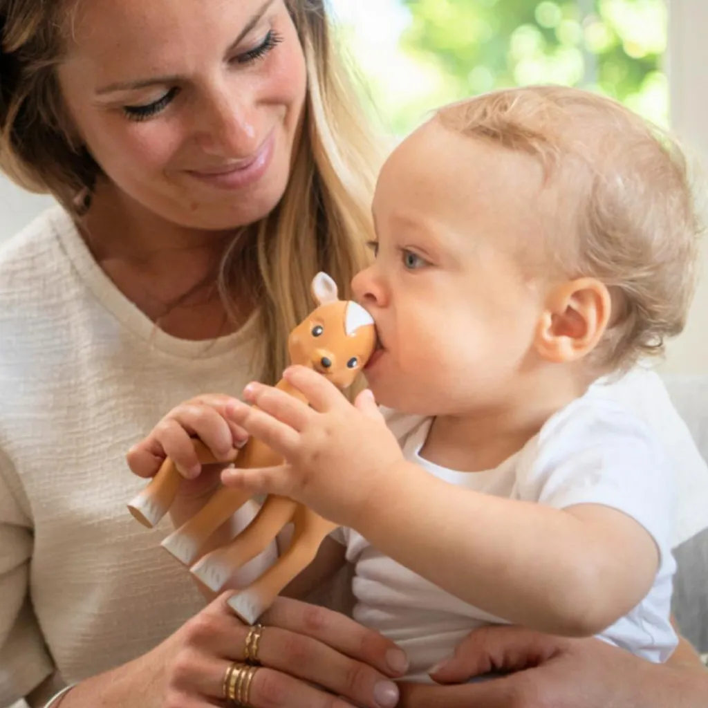 Soulagez les premières poussées dentaires de bébé avec le jouet de dentition Fanfan le faon de Sophie la girafe