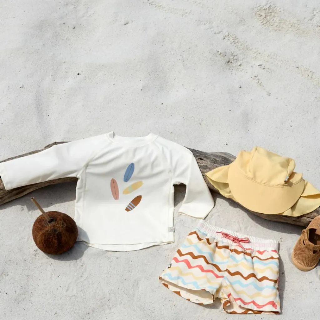 – Avis aux petits surfeurs ! En t-shirt de bains à manches longues avec un indice de protection UV 60, plus rien n’empêche la prochaine baignade à la plage ou à la piscine.