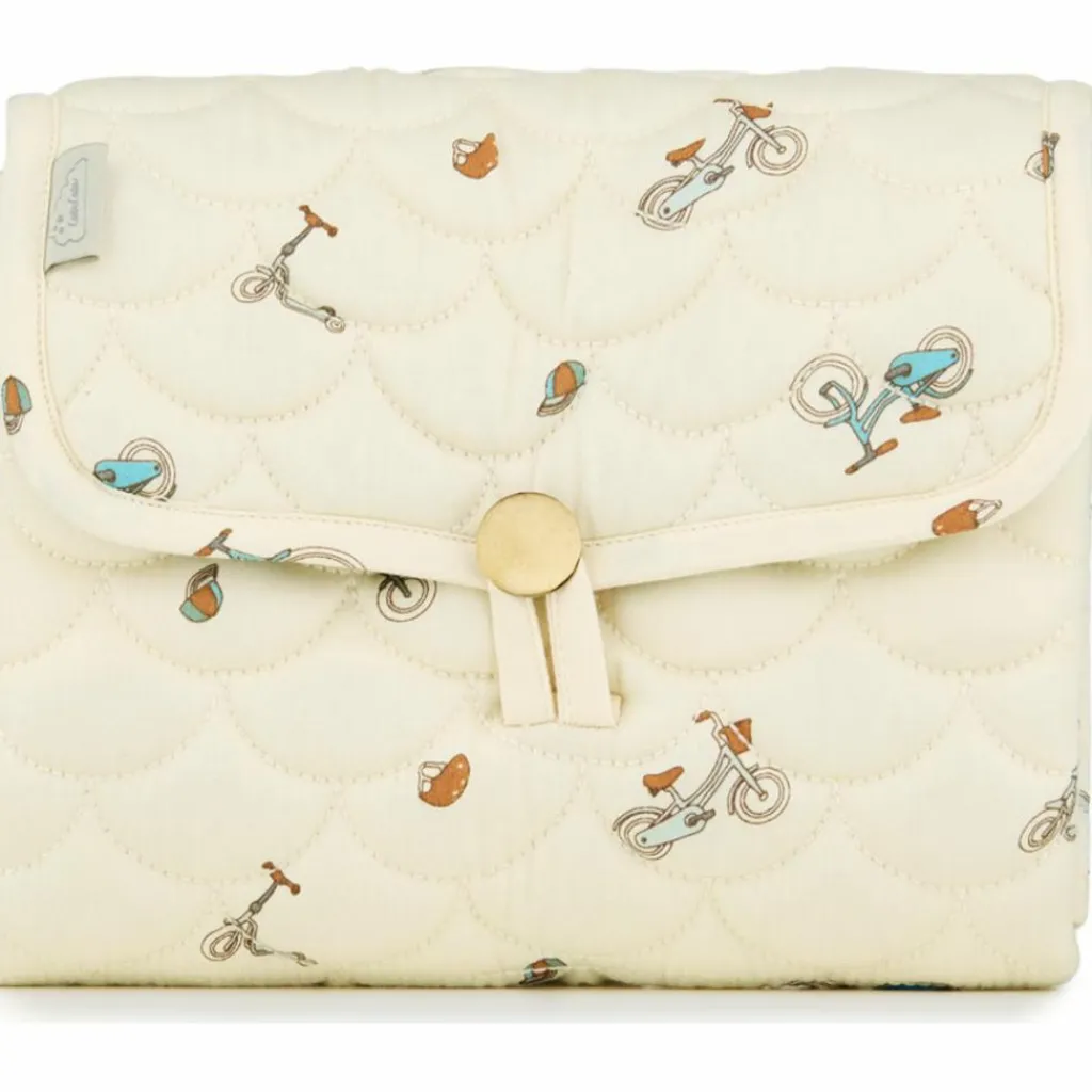 – Matelas à langer de voyage, matelassé dans les tons vert, marron et bleu sur fond blanc crème.