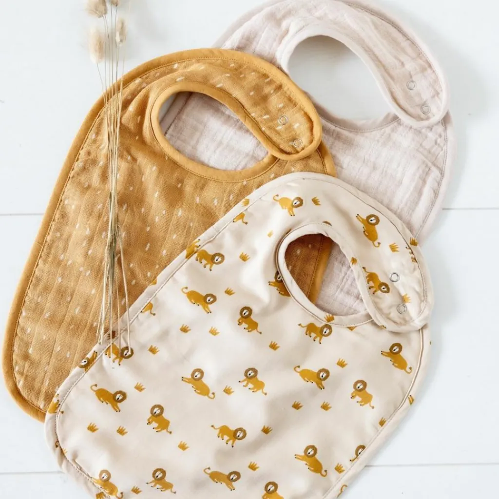 – 1 bavoir imprimé amusant et 2 bavoirs en mousseline de coton.
