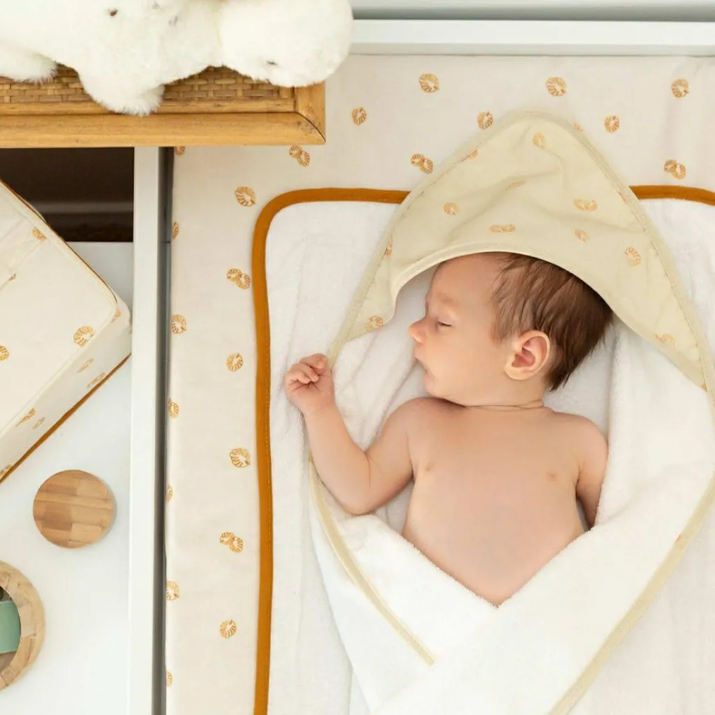 – Cape de bain avec capuche brodée.