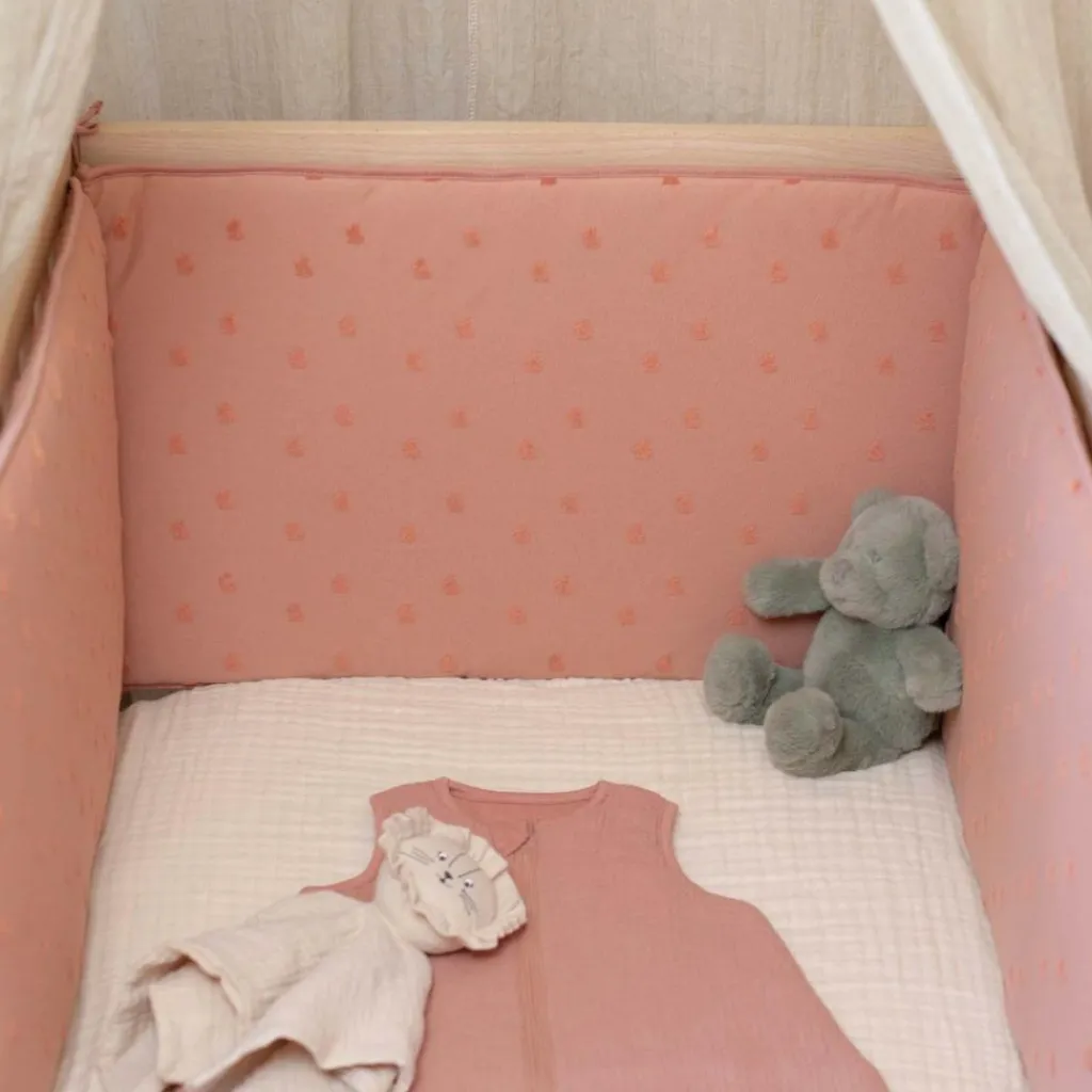 Son design poétique, avec de jolis motifs lapins ton sur ton sur un fond rose tendre, apporte une touche de douceur et d’harmonie à la chambre. Les onglets intégrés permettent d’ajuster parfaitement le tour de lit à la taille du couchage, pour une installation stable et esthétique.