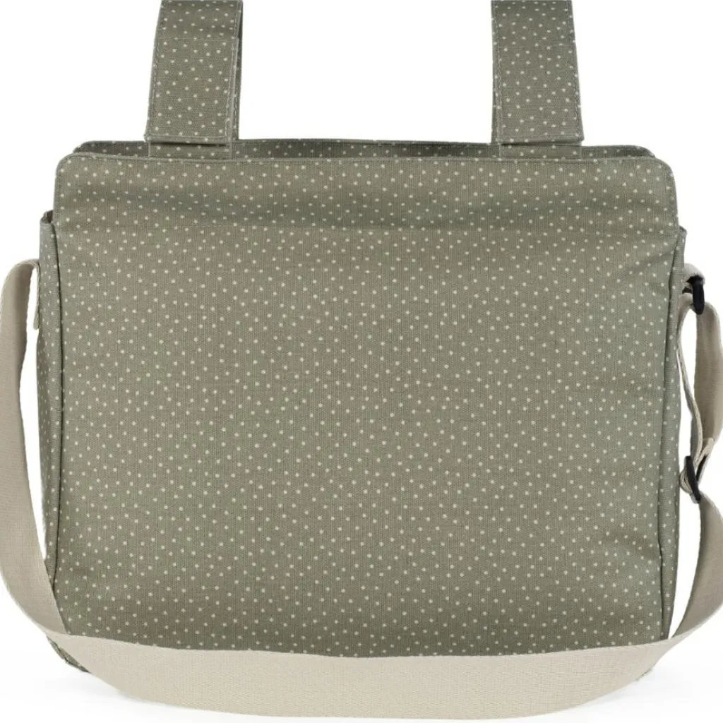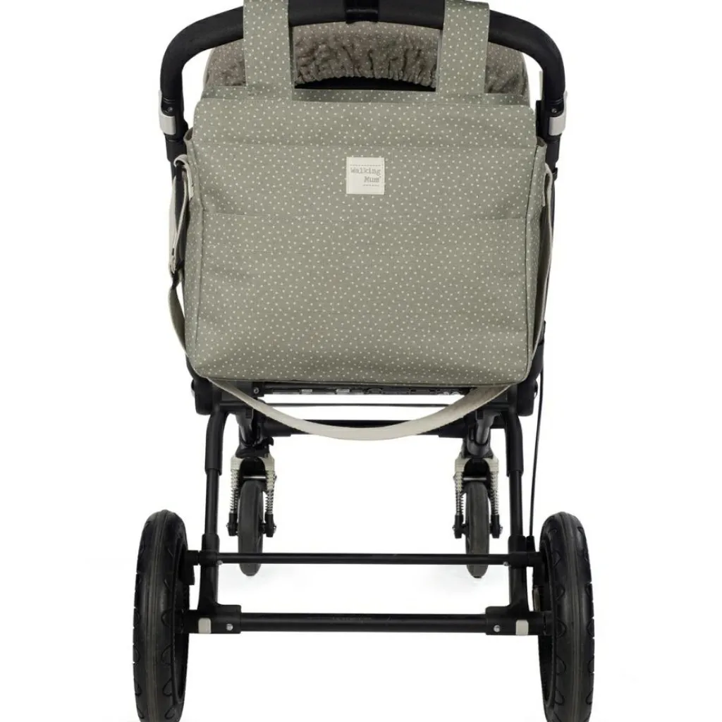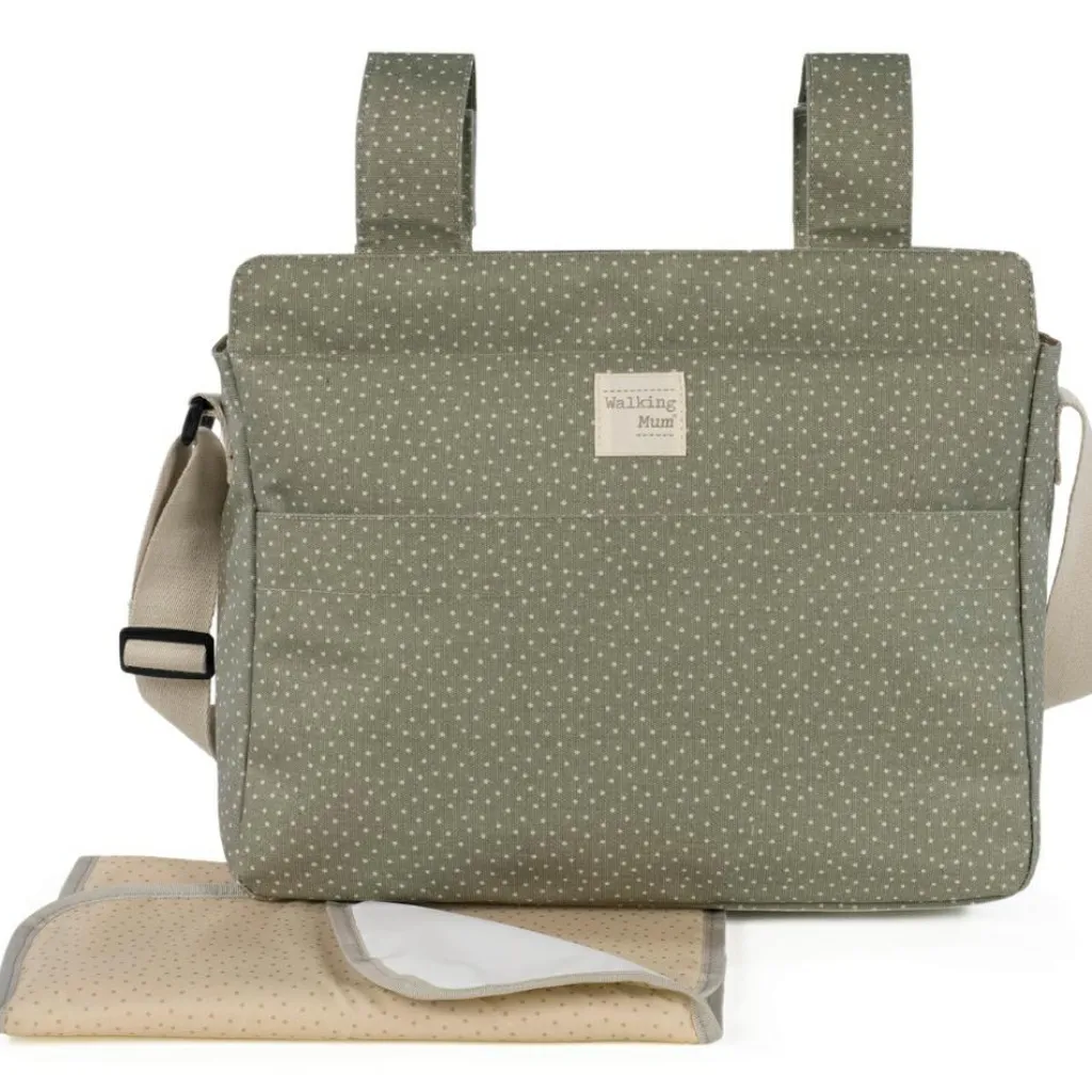 – Sac à langer Poppy Vert Mousse à pois pour poussette comprenant un matelas à langer pour bébé.