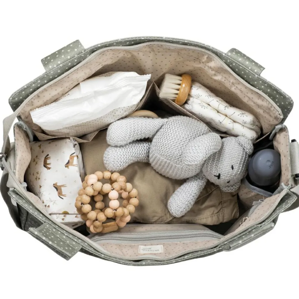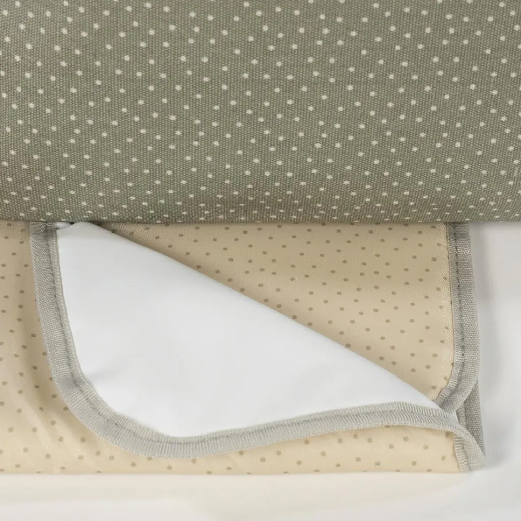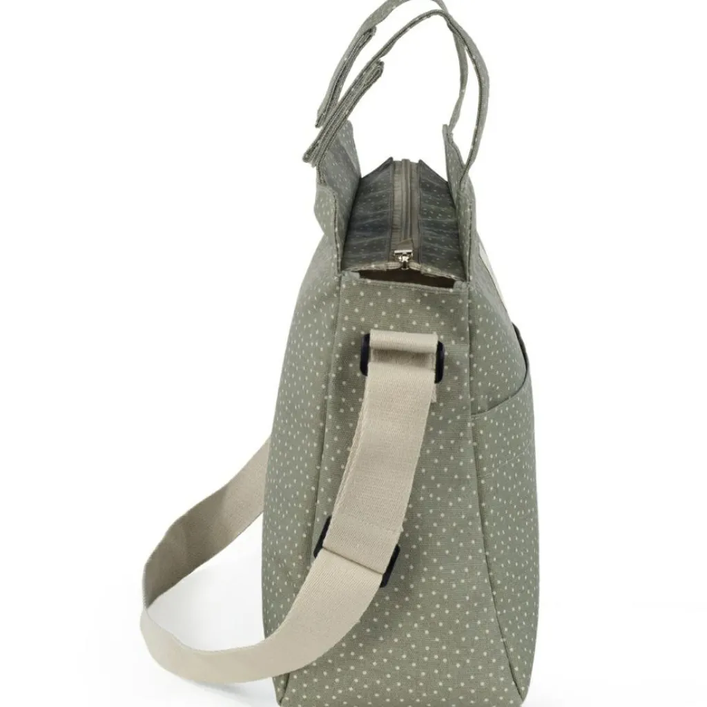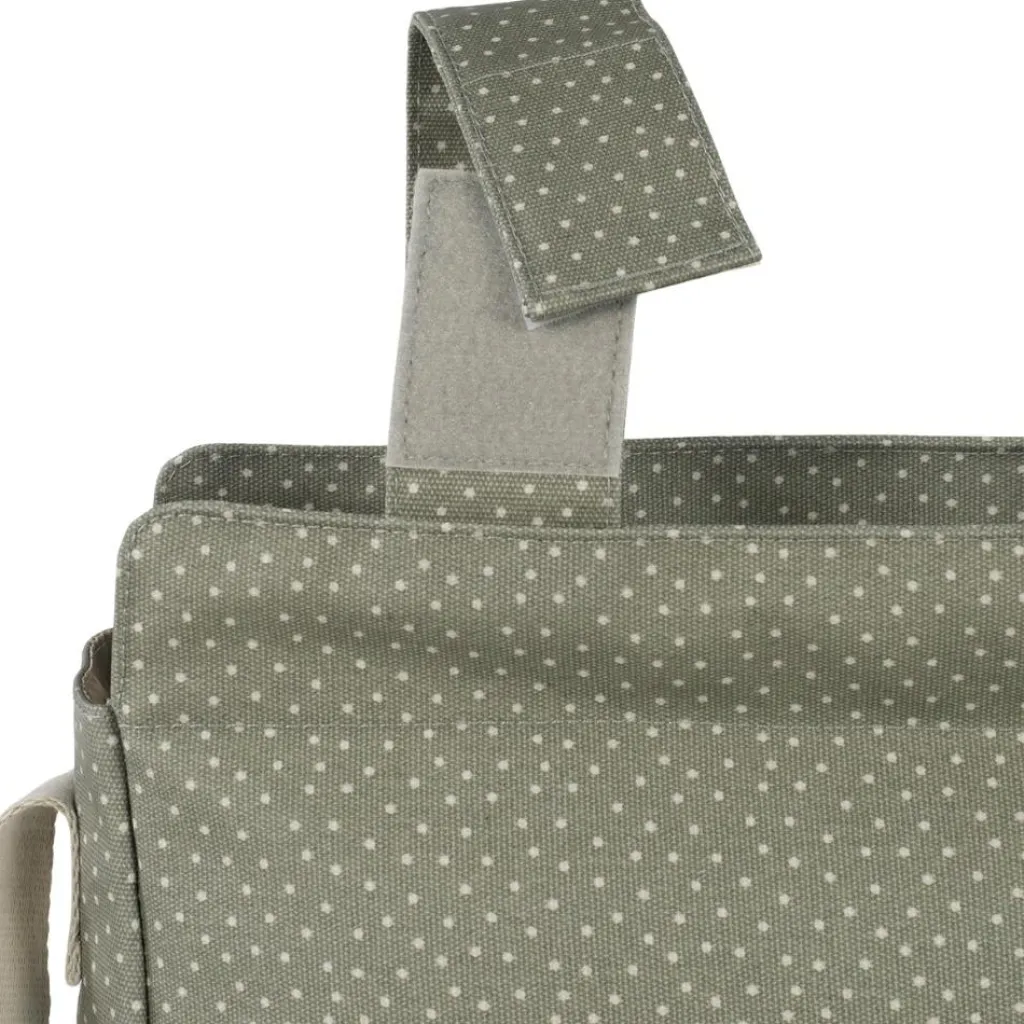 – Sac à langer Poppy Vert Mousse à pois pour poussette comprenant un matelas à langer pour bébé.