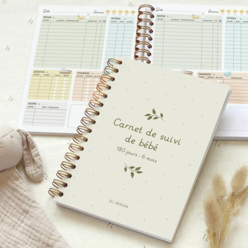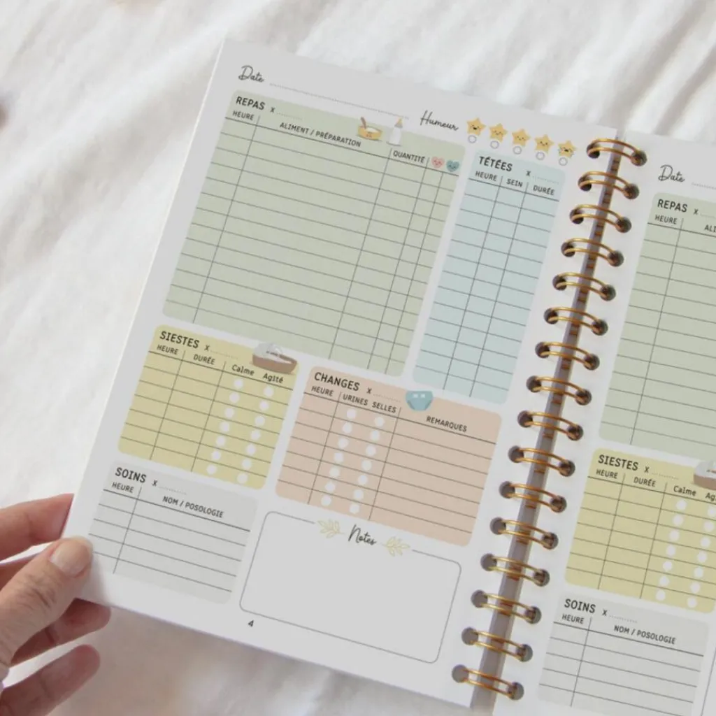 Très pratique et complet, ce carnet de suivi permettra aux parents (ou la personne gardant l’enfant) de noter le suivi de bébé au quotidien sur une période de 6 mois : son alimentation (biberons, tétées, repas…), ses siestes, ses changes, ses soins, le bain..l est à démarrer quand on le souhaite : à partir de la naissance, à partir de 3 mois… etc.