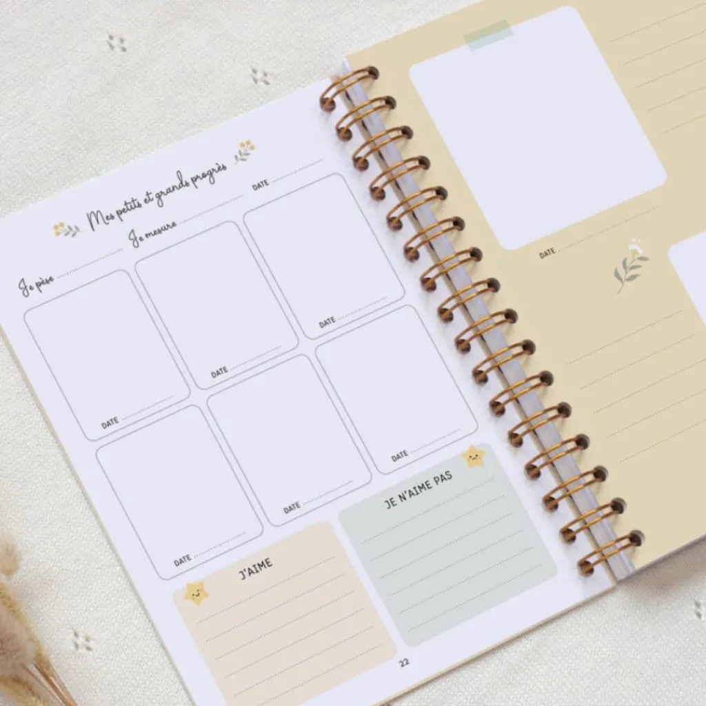 – Une double page toutes les 2 semaines 1/2 pour noter les petits et grands progrès et un emplacement pour coller des photos.