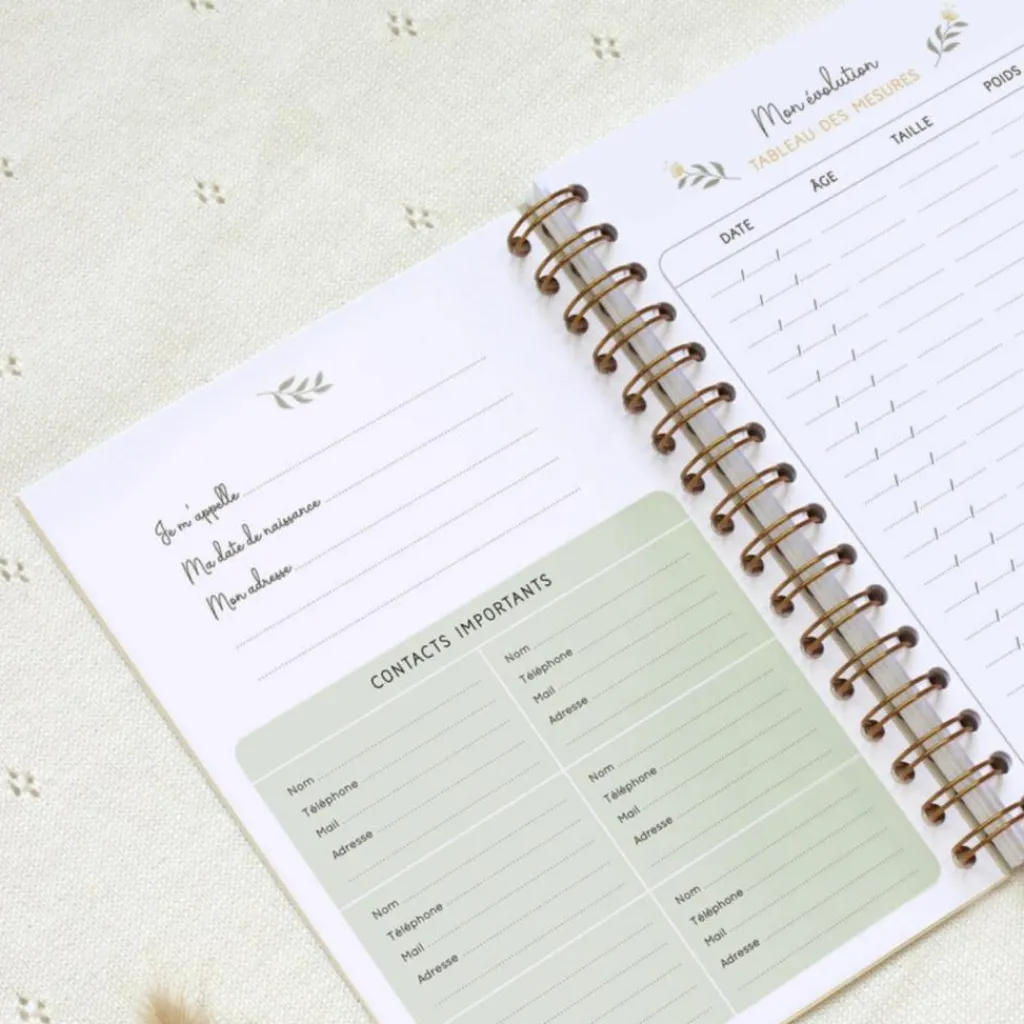 – Une double page de présentation de bébé et les contacts importants (médecins, crèche, nounou, parents…).