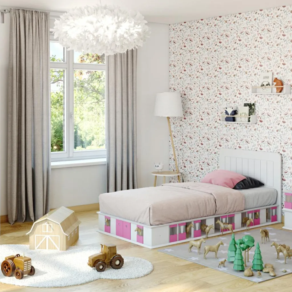 – Les boxes pour les chevaux et les portes de grange permettent à l’enfant de jouer autour du lit.