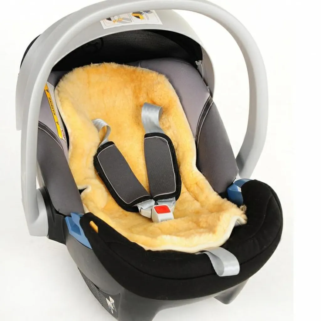 Peau d’agneau fixée par une fermeture velcro à la chancelière.