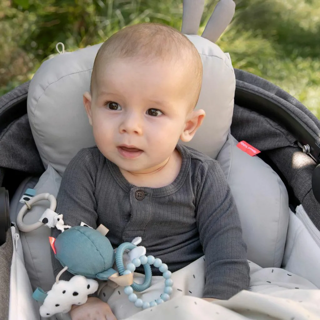 – Maillon pour attacher le jouet à la poussette, au siège-auto ou au coussin de motricité.