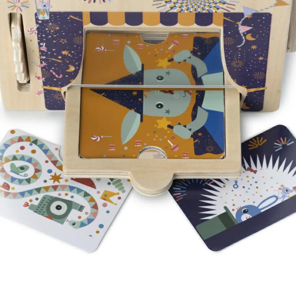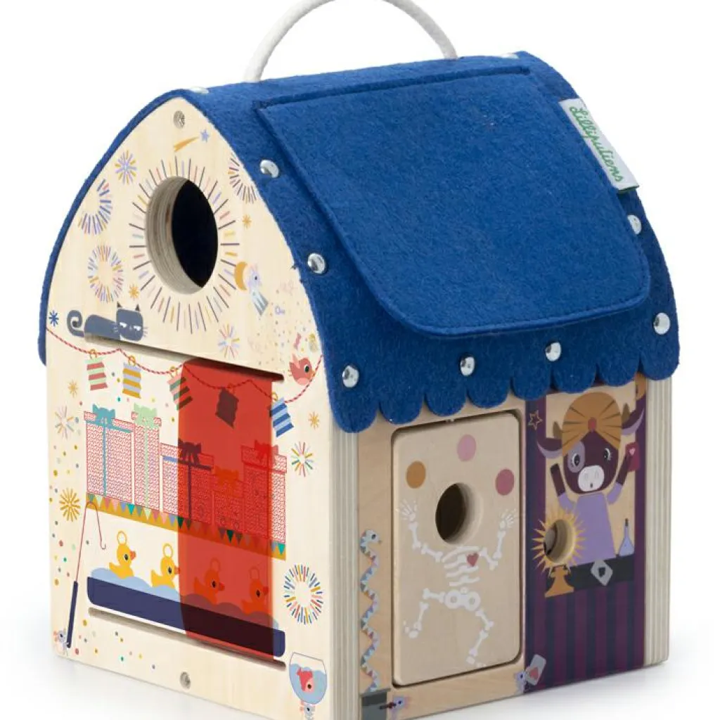 – Comprend 1 maison en bois, 1 kaleidoscope, 3 cartes et 1 personnage en bois.